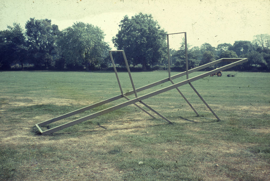 In 1971 a meeting with sculptor Peter Hide led to Foster taking a studio at the Stockwell Depot, which during the seventies would become the most important site for making and showing steel sculpture in Britain. In 1973 he held his first public exhibition, showing alongside Hide in the grounds of Marble Hill House. Foster later wrote that ‘my work at this time fell into two main areas – very simple, frame constructions defining volumes, and more expressive sculpture influenced by Tony Caro. I was also experimenting with concrete in the sculptures to try and introduce weight and mass’. One reviewer of the Marble Hill show saw an ‘aggressive energy’ in Foster’s sculpture, the suggestion of a ‘menacing assembly of war-machines; Renaissance ingenuities pared into streamlined efficiency, generating a quality of dynamic anticipation. Spring, Frame I, II, and III all seem capable of eliminating any object which has trespassed on the space defined by their components.’ (Fenella Crighton, Art International, October 1973)