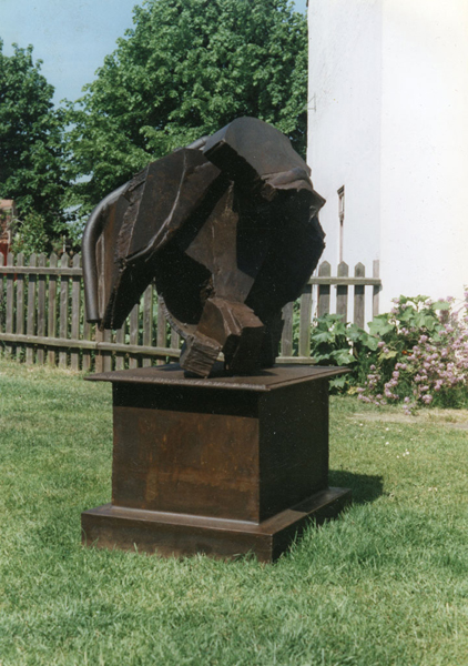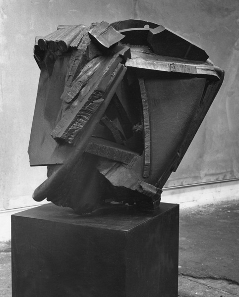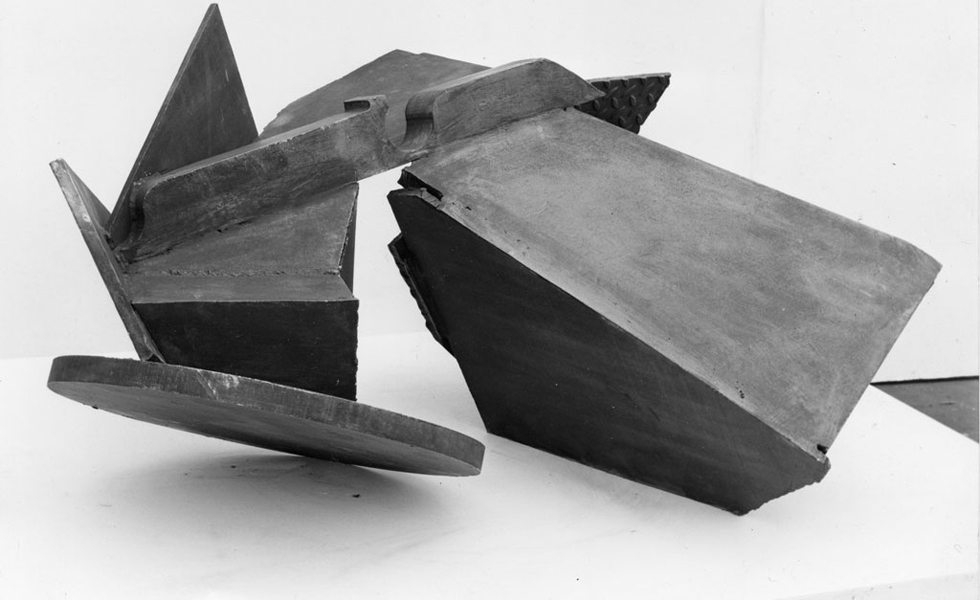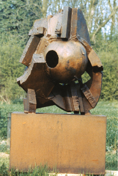 While living and working at Hardingham, Foster continued to show in the Stockwell annual exhibitions, until the last of these in 1979. The 1979 exhibition marked the culmination of the Stockwell sculptors’ efforts to imbue constructed steel sculpture with weight, volume, density and compression. It precipitated a moment of collective crisis, and as the eighties began most of the sculptors, Foster among them, changed their work dramatically. The sculptures Foster made in 1978 and 1979 – such as Full Face, Back Break, Elephant Corner, Outside In – are some of the most massive made by the group. His sculptures of the preceding couple of years used planes in close configuration, but with each plane maintaining its own identity as a separate ‘thing’ within the whole arrangement. In the 1978-79 sculptures this quality – which had been almost axiomatic within constructed steel sculpture – was at least partially lost as the individual pieces of steel were increasingly mashed and melded together, through very thick welds. At times parts seem buried within the sculptures, which can seem more carved or modeled than constructed. Full Face holds itself together like fist, with a fist’s potential energy and its aggression. But crucially its power comes from the fact that its density is articulated, so it is not just a solid lump of steel, but is made dynamic by the lines of force which fan across and through it. Mark Skilton, who worked at the Depot in the late seventies and into the eighties, acknowledged that much of the sculpture made or shown there was brutal in feel, but suggested that the success of individual sculptures depended upon the ‘sensitivity’ with which the material was handled. This mixture of brutality with sensitivity well characterises Full Face.