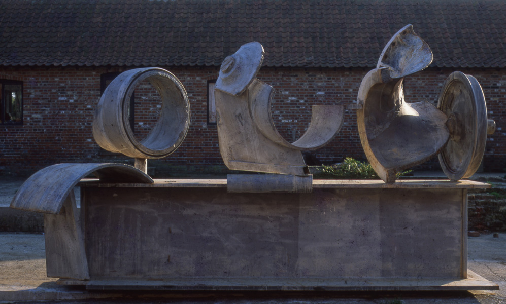 With the group of sculptures made around the turn of the eighties into the nineties – including Drum Solo, Bone China and Rhythm on Two – Foster, partly prompted by a conversation with Clement Greenberg, turned away from the verticals which he had worked with since his abandonment of the massive density of the seventies. From this point on a horizontal orientation would be central to his sculpture. The horizontal freed him from the structural decisions which by necessity restrict vertical sculpture. In Bone China or Drum Solo heavy pieces of steel flow into one another with seeming ease, an opening out of the broken arabesque lines he had explored in the train wheel sculptures, and at larger scale in sculptures such as Westward. It is likely that Foster thought of these sculptures in relation to the Elgin Marbles something much discussed with Valentin Tatransky. The curved hunks of steel are suspended above and below the top of the plinth, clearly designated as a part of the sculpture by the imitations of classical moulding which line its top and bottom edges. This moulding relates visually to the lipped edges of the pieces of steel, and gives the plinth a sense of the sepulchral. The metaphoric or symbolic potential of the upright verticals Foster had previously explored continue here in the contrast between the tomb-like plinth and the dancing steel above.