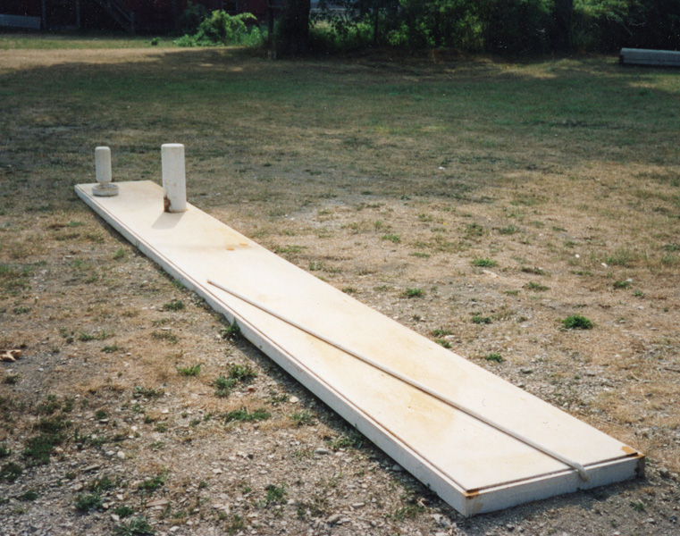 The freedom from structural constraints which the plinths allowed meant that they could be stretched to large dimensions. Between 1991 and 1992 Foster produced a group of very long sculptures, first at Hardingham, and then later at Triangle Workshop, New York State. The drama of Bone China or Drum Solo came from a strongly stated contrast between the still and stable plinths and the enlivened rising serpentine curves of steel the plinths supported. In these later sculptures the contrast is less marked. The plinths generally support only two or three discrete upper elements, which sit low on top of the plinths. Shallow curves, either cut from large steel pipes or bowls, or made by distorting sections of plate or I-beam, mimic this linearity, creating a fluid or somehow sped-up version of it. In Straight Edge on Sloping Base the visual identities of plinth and upper elements are partially reversed; whilst in one of the untitled sculptures made at Triangle the plinth itself is raised off the ground so it appears to float. The main aim of the sculptures seems to have been to accentuate the length of the plinths, to make them seem longer than they are, and to use this length to heighten the effect of a small number of very precise decisions (the particular tilt on this found piece of industrial steel, the height at which an element ‘hovers’). The profile drawing of the Cut-Outs reaches its most elegant conclusion in what are Foster’s most fully aesthetic sculptures.