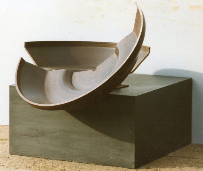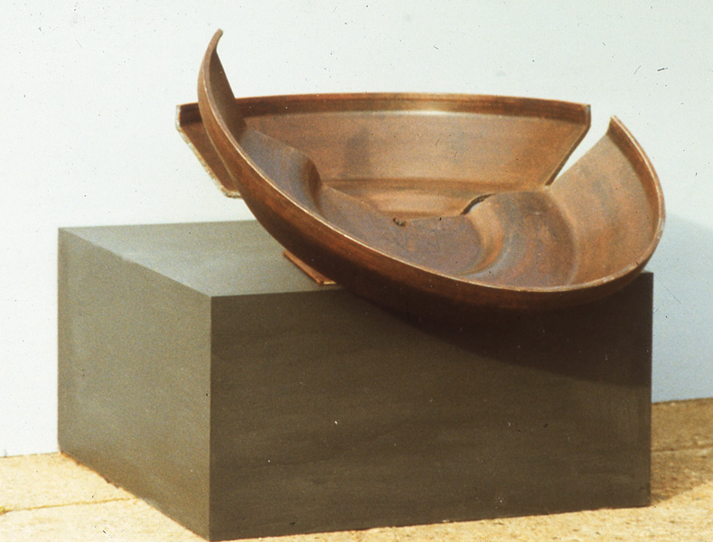 Following sculptures such as Drum Solo or Bone China, Foster made a series of smaller plinth-based works, whose parts were drawn from cut and mangled fragments of gas cylinders. This incorporation of a basic part of the steel-sculptor’s cutting and welding equipment is an example of the wit which underlay some of Foster’s art. The cylinders provided readymade volumes, sometimes flattened out into concave or convex planes, and ending in smooth profiles where the steel folds over itself, or jagged ones where it has been roughly sheared. There is a clear relationship with the arrangements of still-life painting - to its objects, and to the drapery which is used to frame these objects. The ambiguity between these two states, particularly in relation to scale, is important in allowing the fragments to give the sculptures a sense of dynamism beyond the literal.