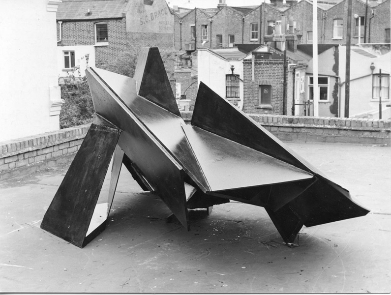While living and working at Hardingham, Foster continued to show in the Stockwell annual exhibitions, until the last of these in 1979. The 1979 exhibition marked the culmination of the Stockwell sculptors’ efforts to imbue constructed steel sculpture with weight, volume, density and compression. It precipitated a moment of collective crisis, and as the eighties began most of the sculptors, Foster among them, changed their work dramatically. The sculptures Foster made in 1978 and 1979 – such as Full Face, Back Break, Elephant Corner, Outside In – are some of the most massive made by the group. His sculptures of the preceding couple of years used planes in close configuration, but with each plane maintaining its own identity as a separate ‘thing’ within the whole arrangement. In the 1978-79 sculptures this quality – which had been almost axiomatic within constructed steel sculpture – was at least partially lost as the individual pieces of steel were increasingly mashed and melded together, through very thick welds. At times parts seem buried within the sculptures, which can seem more carved or modeled than constructed. Full Face holds itself together like fist, with a fist’s potential energy and its aggression. But crucially its power comes from the fact that its density is articulated, so it is not just a solid lump of steel, but is made dynamic by the lines of force which fan across and through it. Mark Skilton, who worked at the Depot in the late seventies and into the eighties, acknowledged that much of the sculpture made or shown there was brutal in feel, but suggested that the success of individual sculptures depended upon the ‘sensitivity’ with which the material was handled. This mixture of brutality with sensitivity well characterises Full Face.