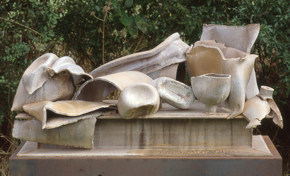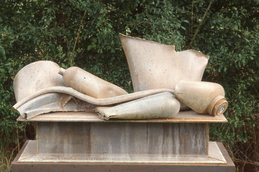 Following sculptures such as Drum Solo or Bone China, Foster made a series of smaller plinth-based works, whose parts were drawn from cut and mangled fragments of gas cylinders. This incorporation of a basic part of the steel-sculptor’s cutting and welding equipment is an example of the wit which underlay some of Foster’s art. The cylinders provided readymade volumes, sometimes flattened out into concave or convex planes, and ending in smooth profiles where the steel folds over itself, or jagged ones where it has been roughly sheared. There is a clear relationship with the arrangements of still-life painting - to its objects, and to the drapery which is used to frame these objects. The ambiguity between these two states, particularly in relation to scale, is important in allowing the fragments to give the sculptures a sense of dynamism beyond the literal.