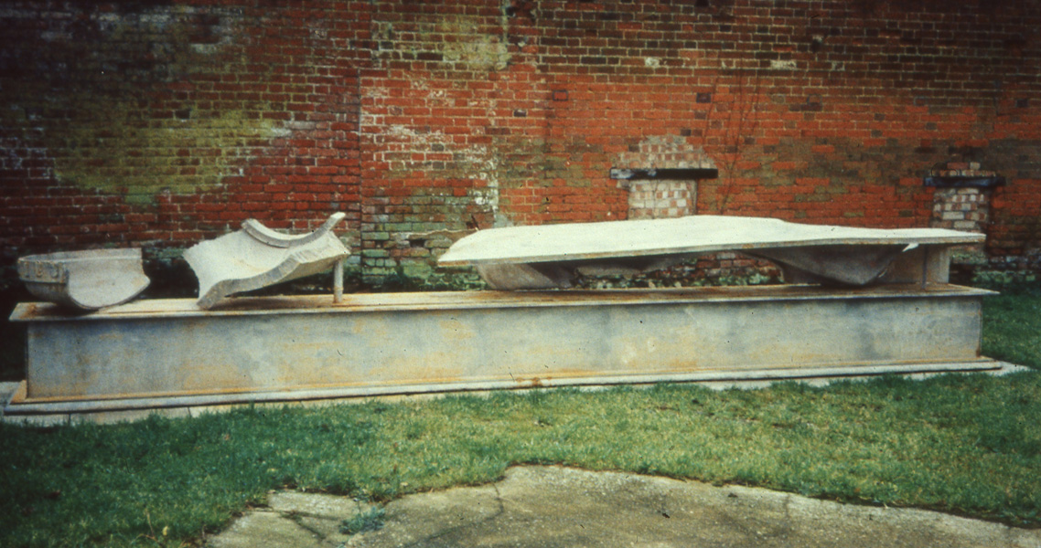 With the group of sculptures made around the turn of the eighties into the nineties – including Drum Solo, Bone China and Rhythm on Two – Foster, partly prompted by a conversation with Clement Greenberg, turned away from the verticals which he had worked with since his abandonment of the massive density of the seventies. From this point on a horizontal orientation would be central to his sculpture. The horizontal freed him from the structural decisions which by necessity restrict vertical sculpture. In Bone China or Drum Solo heavy pieces of steel flow into one another with seeming ease, an opening out of the broken arabesque lines he had explored in the train wheel sculptures, and at larger scale in sculptures such as Westward. It is likely that Foster thought of these sculptures in relation to the Elgin Marbles something much discussed with Valentin Tatransky. The curved hunks of steel are suspended above and below the top of the plinth, clearly designated as a part of the sculpture by the imitations of classical moulding which line its top and bottom edges. This moulding relates visually to the lipped edges of the pieces of steel, and gives the plinth a sense of the sepulchral. The metaphoric or symbolic potential of the upright verticals Foster had previously explored continue here in the contrast between the tomb-like plinth and the dancing steel above.