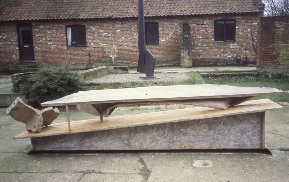 The freedom from structural constraints which the plinths allowed meant that they could be stretched to large dimensions. Between 1991 and 1992 Foster produced a group of very long sculptures, first at Hardingham, and then later at Triangle Workshop, New York State. The drama of Bone China or Drum Solo came from a strongly stated contrast between the still and stable plinths and the enlivened rising serpentine curves of steel the plinths supported. In these later sculptures the contrast is less marked. The plinths generally support only two or three discrete upper elements, which sit low on top of the plinths. Shallow curves, either cut from large steel pipes or bowls, or made by distorting sections of plate or I-beam, mimic this linearity, creating a fluid or somehow sped-up version of it. In Straight Edge on Sloping Base the visual identities of plinth and upper elements are partially reversed; whilst in one of the untitled sculptures made at Triangle the plinth itself is raised off the ground so it appears to float. The main aim of the sculptures seems to have been to accentuate the length of the plinths, to make them seem longer than they are, and to use this length to heighten the effect of a small number of very precise decisions (the particular tilt on this found piece of industrial steel, the height at which an element ‘hovers’). The profile drawing of the Cut-Outs reaches its most elegant conclusion in what are Foster’s most fully aesthetic sculptures.