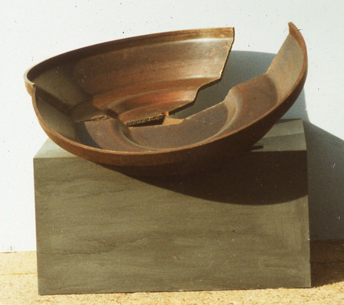 The small series of Bowls are Foster’s final steel sculptures. In them the contrast between curved shape and rectilinear plinth, a theme which first entered his sculpture a decade earlier, is given its most minimal exposition. To a greater extent than the Cut-Outs, the Buffers, the Train Wheels or the Plinths the found character of the steel is preserved. There is a clear sense of each bowl as an upturned, open hemispherical volume, and its completeness as such is confirmed as much as it is disrupted by the cutting, separating and tilting Foster performs upon it. They are wholes rather than fragments. The allusions to classical moulding which had previously clearly designated the plinths as part of the sculpture are done away with; but despite this the plinths remain equivalents to the upper elements, rather than just supports for them. Where the parts in Bone China or Straight Edge on Sloping Base describe a sequential movement, the Bowls relate to their plinths singularly and all at once – an open and stilled upper volume is matched by a closed and still volume below. The potential for slightness in the idea is overcome by the solidity with which it is executed. As Valentin Tatransky put it: ‘my friend really does form for form’s sake... he feels the weight of things, that gravity itself draws the shape of things.’
